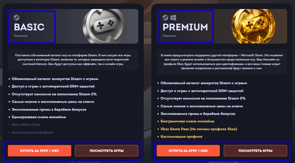 Остальные функции (каталог Steam-игр, доступ к DRM-защите, нулевая комиссия на пополнение, низкие цены на ключи, бонусы и кастомизация профиля) одинаковы для обеих подписок.