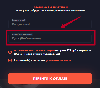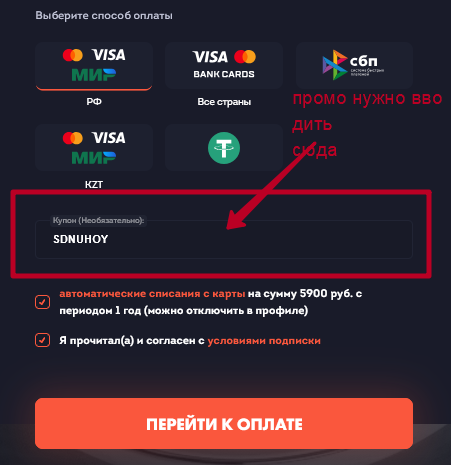 9. Вам остается только вставить скопированный купон в специальное поле при покупке подписки и перейти к оплате.