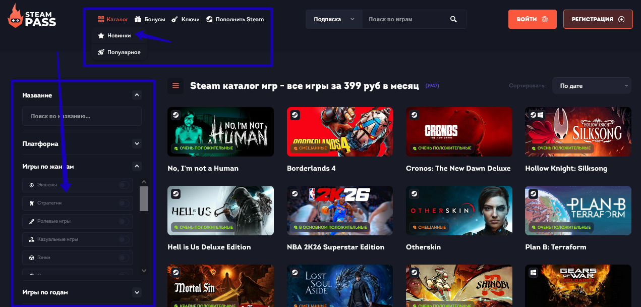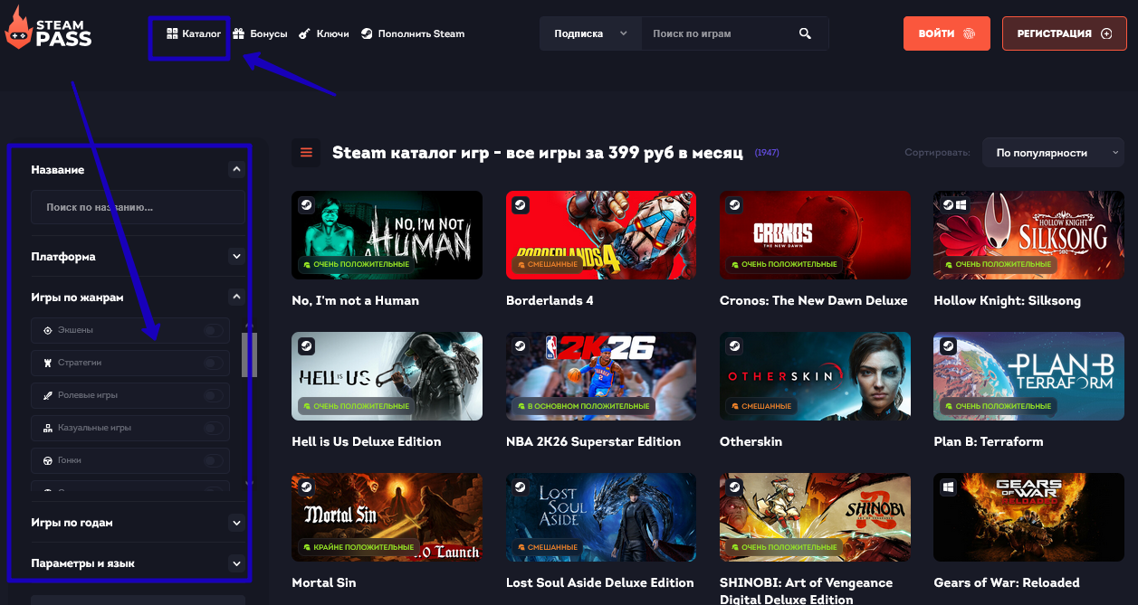 1. Доступ к обширной библиотеке игр Steam, включая новинки и популярные игры (В разделе Каталог)