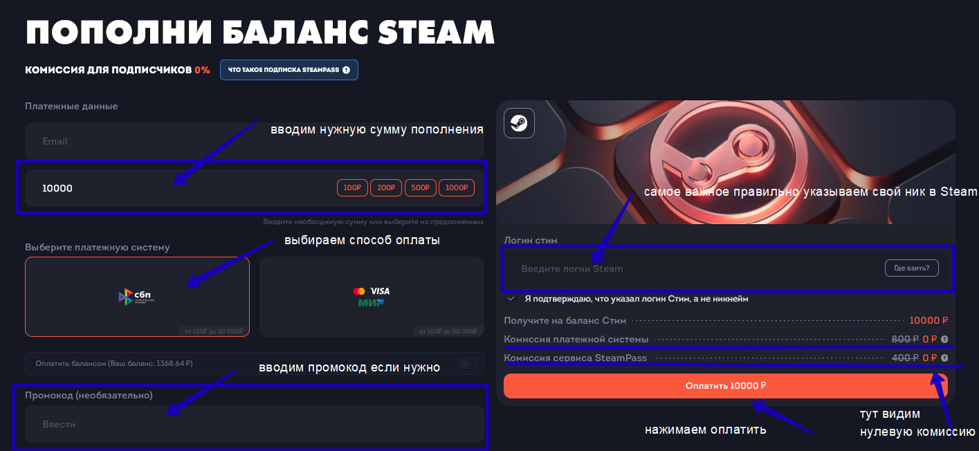 3. Пополнение Steam-аккаунта с комиссией 0% с уже оформленной подпиской