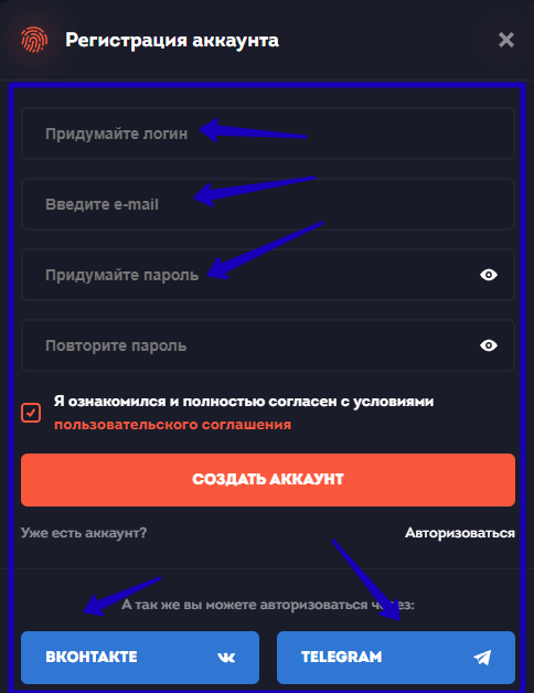 1.2 Создайте учетную запись нажав на кнопку регистрация в правом углу сайта. Далее вам нужно будет заполнить все поля. Как указано на картинке. Для авторизации вы можете использовать ваш аккаунт во Вконтакте или Телеграмме.