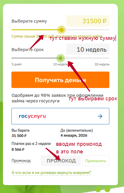 Возьмите заем на выгодных условиях! Максимальная сумма займа – 100 000 рублей (до 30000 – для новых клиентов), процентная ставка – от 0,76% в день! При использовании промокода вы получаете скидку 25% от суммы ежедневной процентной ставки. Эксклюзивная скидка 25%. Промокод только у нас. Промокод нужно вводить без пробелов иначе скидка не сработает